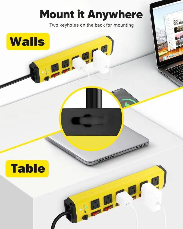 Wall Mount Design This wall mount power strip complete with screw holes for wall or bench mounting, can be mounted to any desired locations or hung on the hook. Being mountable gives convenient access to power sources when you plug and unplug devices with just one hand. The bright yellow design ensures clear visibility and quick connection even in dim construction environments.