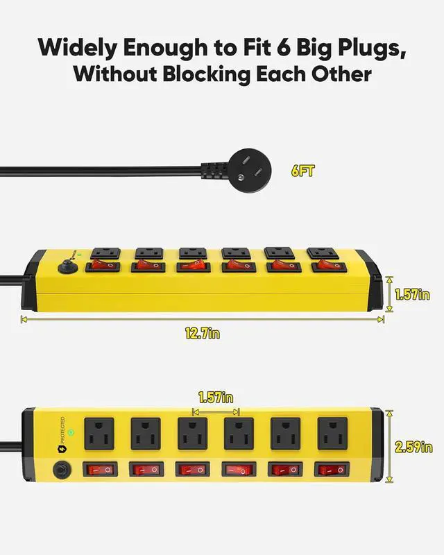 Individual Switches & Wide Spaced Outlets This heavy duty power strip with individual switches provides complete control, maximize energy savings and safety. Each outlet is equipped with its own individual switches, offering you the freedom to control each device separately, eliminating wasteful standby power and providing straightforward operation. The widely spaced design accommodates large power adapters and plugs simultaneously without blocking neighboring outlets.