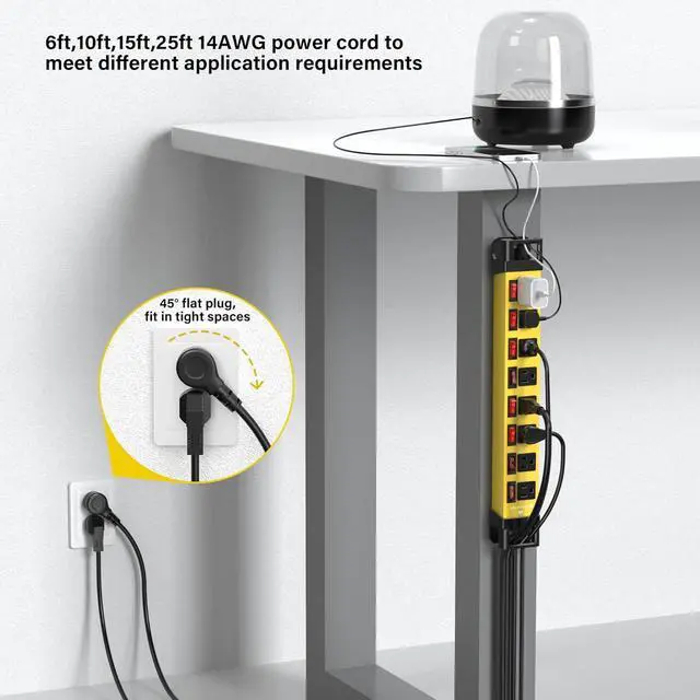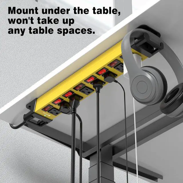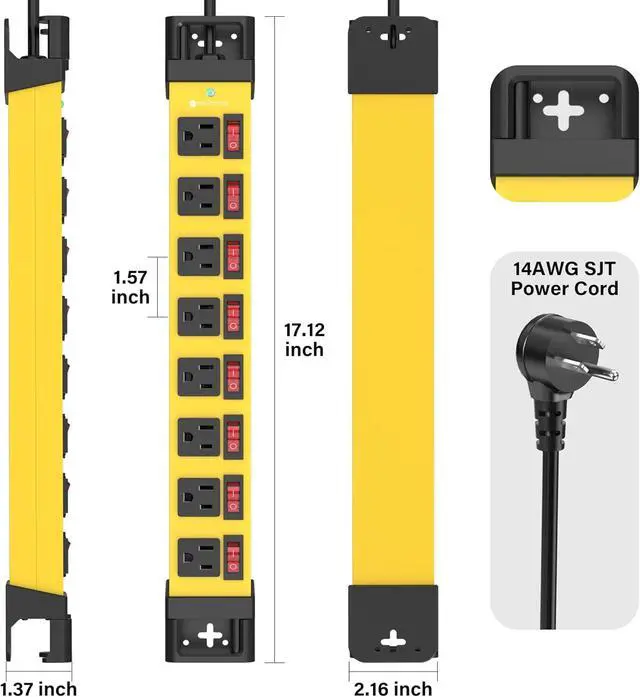 This mountable power strip is crafted from 1.5 mm extra thick aluminum alloy housing and reinforced plastic covering, offers strong wear resistance, fire protection and impact prevention. It' s strong enough to handle tough jobs in garage, workshop, office, home, garden, school, etc. The 14AWG SJT grade wire supports power up to 1875W and better corrosion and oil resistance.