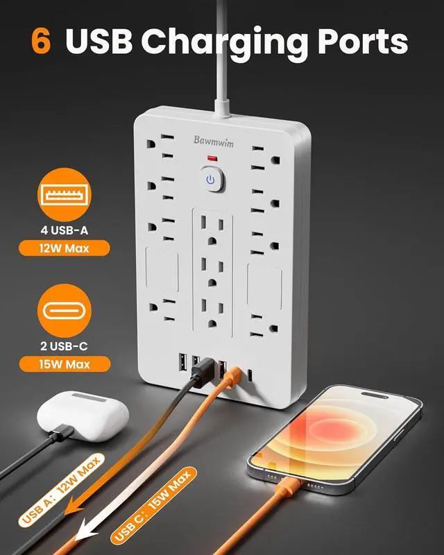 6 USB Charging PortsBawmwim power strip with USB ports includes 6 USB ports (4 USB-A and 2 USB-C) that deliver fast, stable charging with 2.4A output per USB-A port and 3A output per USB-C port. USB power strip ports provide reliable power for smartphones, tablets, wireless headphones, and other USB-powered devices, eliminating the need for extra adapters
