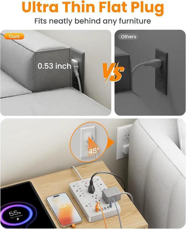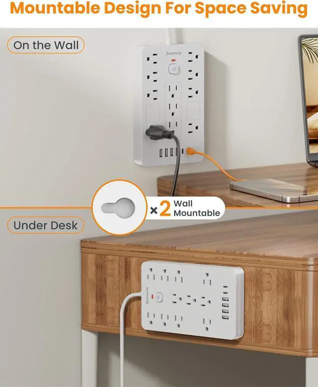 Space-Saving Flat Plug - Bawmwim ultra-slim flat plug power strip design ( 0.53 inches thick) and 45-degree right-angle plug prevent obstruction of neighboring outlets. Bawmwim flat surge protector power strip also functions as a wall mount power strip with two mounting holes for flexible wall or desk installation