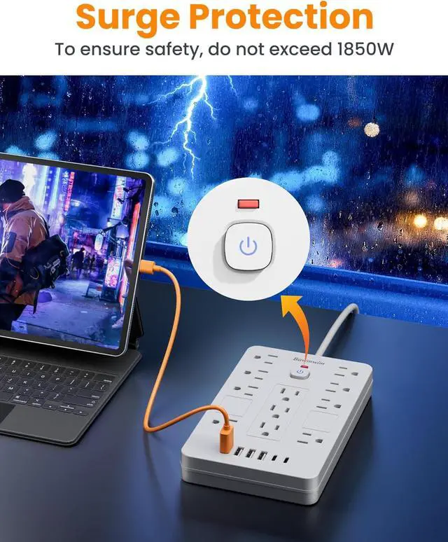 Multiple Security ProtectionBawmwim 17in1 multi plug outlet surge protector integrates an 8-point safety system, including surge protection, fire resistance, overload protection, temperature control, and more. It has overload protection and will light up red during normal operation. When overloaded, the power switch will automatically trip to protect the equipment. Press the switch to restore. It ensures complete safety for you and your devices, whether at home or in the office, for long-lasting and stable operation