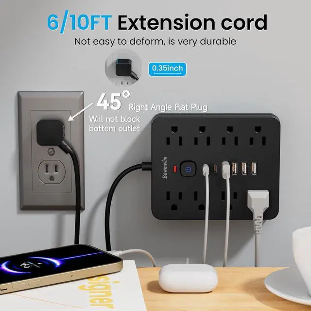 Extension cord with multiple outletsBawmwim Charge effortlessly in any spacetuck the Bawmwim surge protector behind your living room TV, power up your office devices, or slip it into your travel bag for hotel stays. Its ultra-slim design fits seamlessly in dorm rooms, keeping phones, laptops, and gadgets neatly organized. Perfect as a surge protector with USB ports for bedrooms, offices, RVs, and travel. Enjoy the perfect blend of safety and convenience in one compact extension cord with multiple outlets! Available in 6/10/15/20-feet