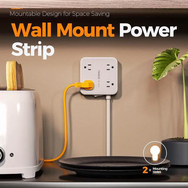 Mountable Power Strip: 2 mounting holes design allow flat extension cord securely installed in various applications, such as wall mounts, floor mounts, under counters and more; 4 rubber feet at the bottom efficiently keep it from slipping and sliding