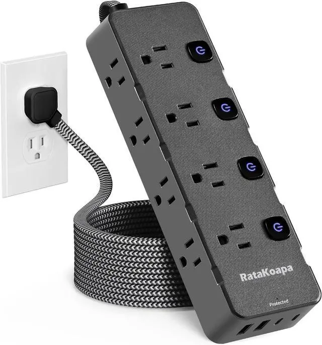 10 Ft Braided Extension Cord: This 10 ft flat extension cord is perfect for reaching distant outlets, it provides flexibility regarding where to place the power strip. In addition, the braided power cord resists deformation, is highly durable, and is safer
