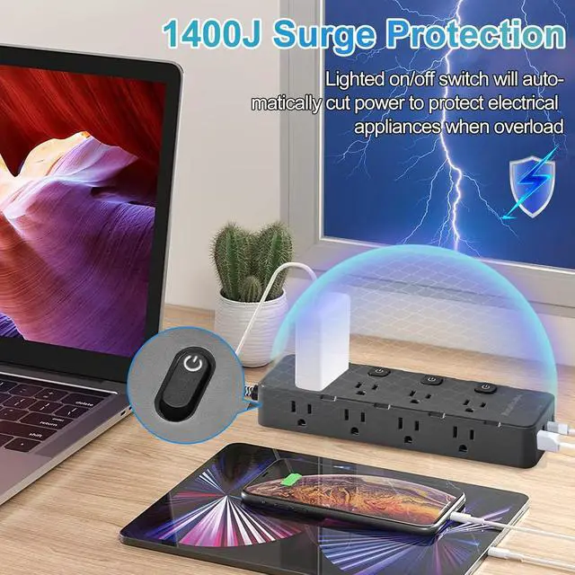 1400J Surge Protection with Overload Switch: The electric strip has a 1400J energy rating providing a reliable power extension cord to protect your devices from the damage of lightning strikes and sudden surges. At the same time, the overload protector switch will shut off automatically when the electrical circuit is abnormal to keep your devices safe