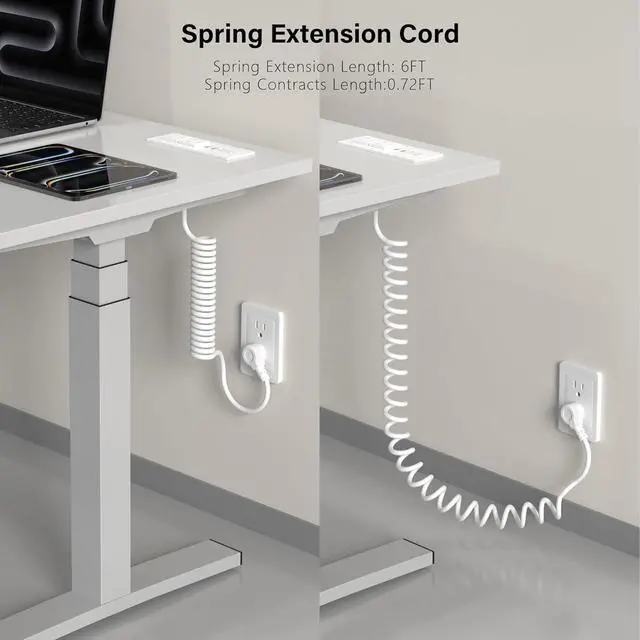 Flexible spring cable, 0.72 ft before stretching, maximum stretch length is 6 feet. 14 AWG 15Amp Spring Extension Cord.