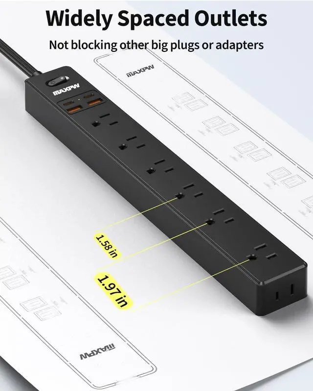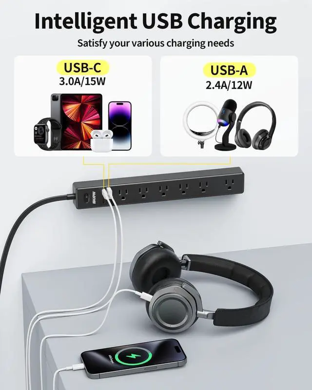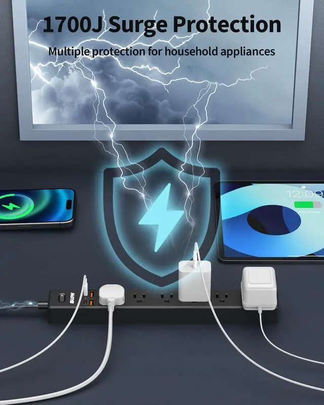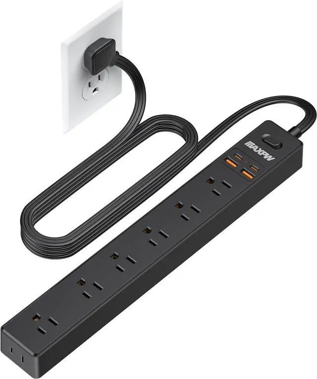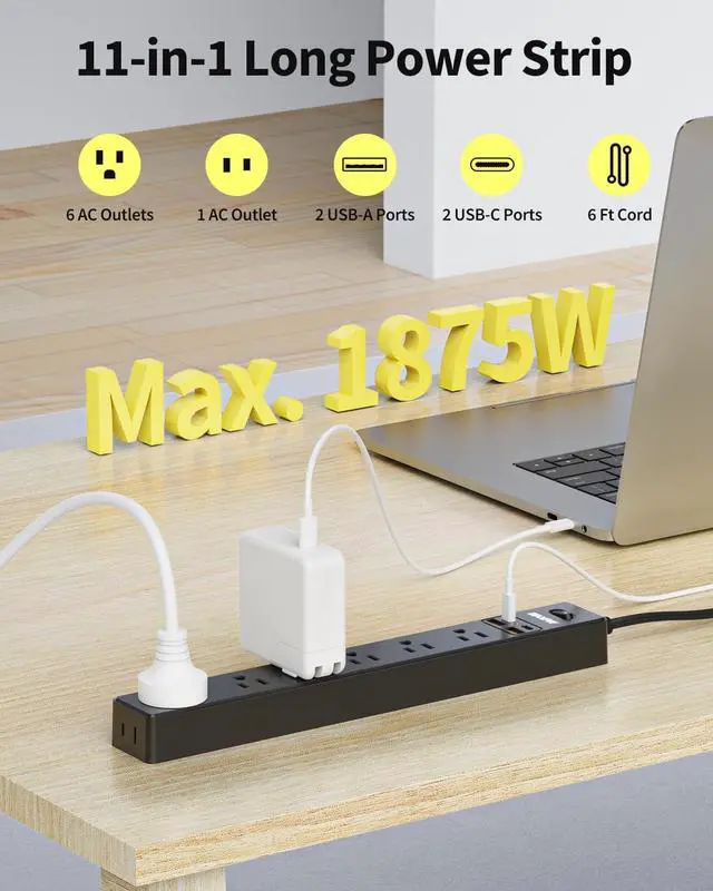 Handles All Your Needs-Equipped with 7 outlets and 4 USB (2 Type-C) ports, this 10-foot power strip turns 1 outlet into 11, allowing you to power 11 devices simultaneously to save more time.