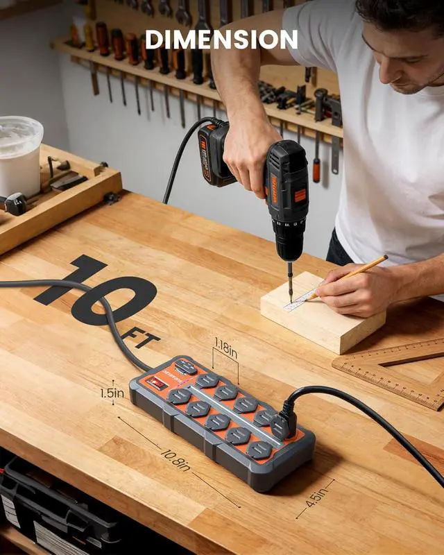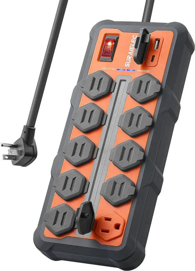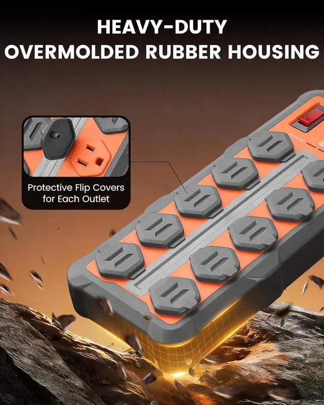 Overmolded Rubber Housing: Heavy-duty, one-piece rubber-overmolded design helps resist impacts, drops, and daily wear. Protective flip covers for each outlet shield sockets when not in use, enhancing durability for workshops, garages, and everyday use