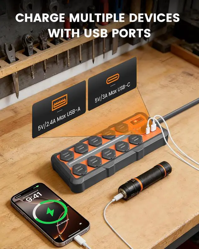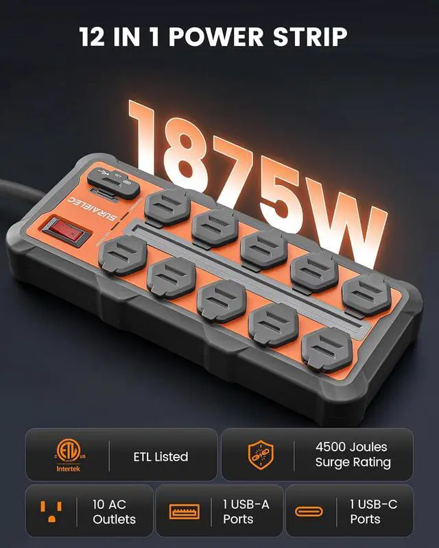 USB: Power up multiple devices at once with 10 AC outlets plus USB-A and USB-C ports, rated 125 V AC, 60 Hz, 15A/1875W. ETL listed; designed to reduce clutter and keep tools and electronics organized