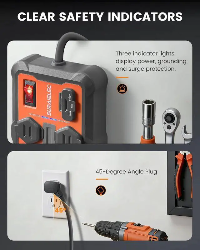 Clear Safety Indicators & 45° Flat Plug: Three indicator lights display power, grounding, and surge protection status at a glance. The 45° low-profile flat plug fits easily behind furniture, workbenches, or equipment without blocking space