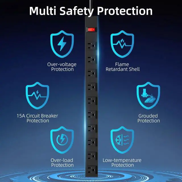 OVERLOAD PROTECTION: A power switch with lighting has a built-in high quality 15A circuit breaker for overload protection. When the operating current exceeds the rated current, this power strip automatically cuts off the power supply from spikes, fires or other unsafe conditions.