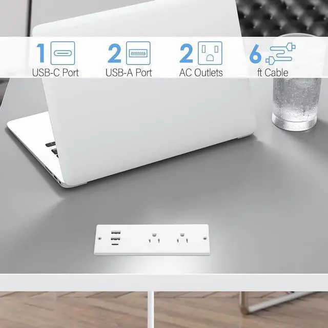 Creative Flush Mount Desktop Design Space Saving: with 2 Outlets, 3 USB ports on the top of the desk power strip. Mounts nearly flush into any surface.