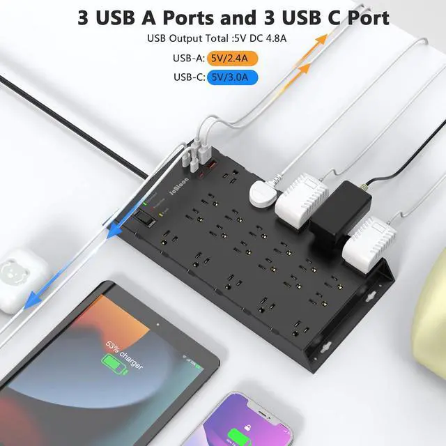 28-in-1 Multi Plug Power StripWith multiple safety-certified, the extension cord and flat plug certified by UL. Jcblaon Power Strip Surger Protector features 22 grounded 3 sockets and 6 USB ports (3 USB-C & 3 USB-A), providing power for all devices that you need to plug in at one location. Perfect for phone, gaming, camera, TV, iphone, PC, laptop, fan, gaming computers, lamps, and other devices simultaneously.