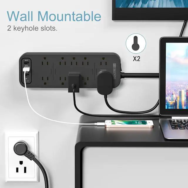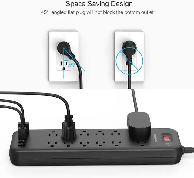 45° Angled Flat Plug & Wall Mountable The space-saving design of the 45° angle flat plug allows the power cord to sit close to the wall so that it could be easily hide in the back the furniture. The 2 slotted holes on the back also allows you securely hung the power strip USB on various places, such as wall, workbenches, desk, under counters & more.