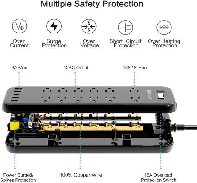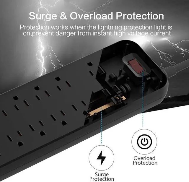 Surge Protection & Overload Protection The surge protector with USB features 3600J surge protection rating, which will always to keep all your devices safe from power surges and spikes. With integrated circuit breaker, the power ON/OFF switch will trip off automatically while your devices and your home in the event of power overload.