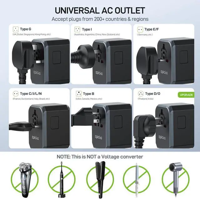 WORLDWIDE ADAPTER - Our all-in-one adapter is equipped with 5 different plug types that could plug into the sockets of 200+ countries and regions: Type C (most popular type) for use in most of Europe, including France, Germany, Italy, Spain, Iceland, Greece, and many other countries; Type G for UK, Ireland, HK, Malaysia, Singapore; Type I for China, Australia, New Zealand, Argentina; Type A/B for USA, Mexico, Canada, and Japan. Important NoteThis adapter does NOT work in India (Type D) or South Africa (Type M) and does NOT convert voltage.