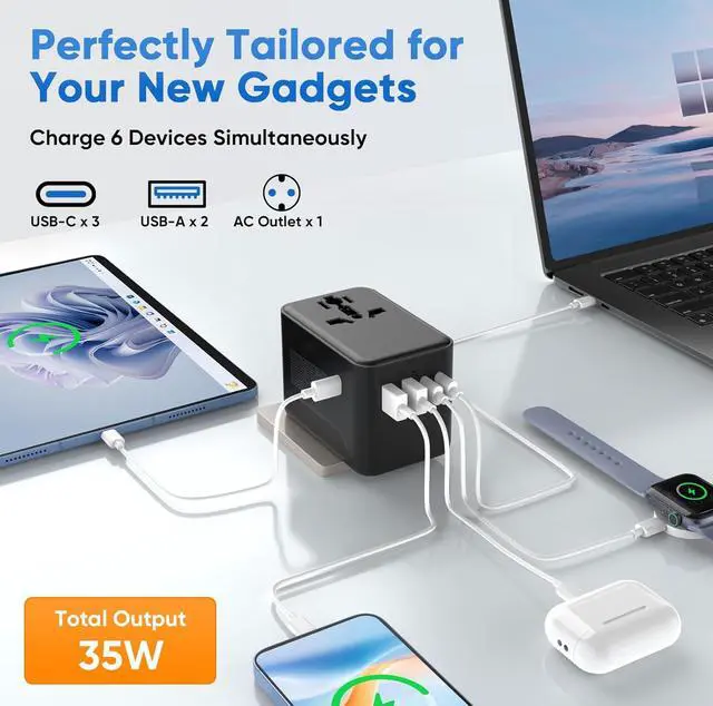 6-IN-1 TRAVEL PLUGS ADAPTER - Equipped with 2 USB-A ports ( 2.4A ), 3 USB-C ports (3A), and 1 AC power outlet, it can quickly charge up to 6 devices simultaneously. Perfect for charging cell phones, tablets, cameras, headphones, and more. Keep your devices fully charged during your travels.