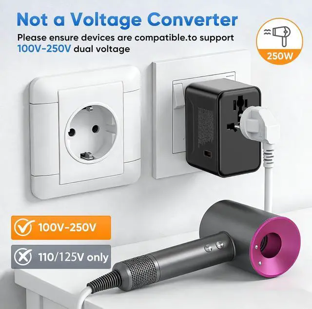 IMPORTANT VOLTAGE NOTICE - This travel adapter is not a voltage converter; it cannot convert AC voltage, only the plug type. If you wish to use appliances such as hair dryers, shavers, or hair straighteners, please ensure they support a wide voltage range (100V-250V) and a current of 10A to ensure safe use.