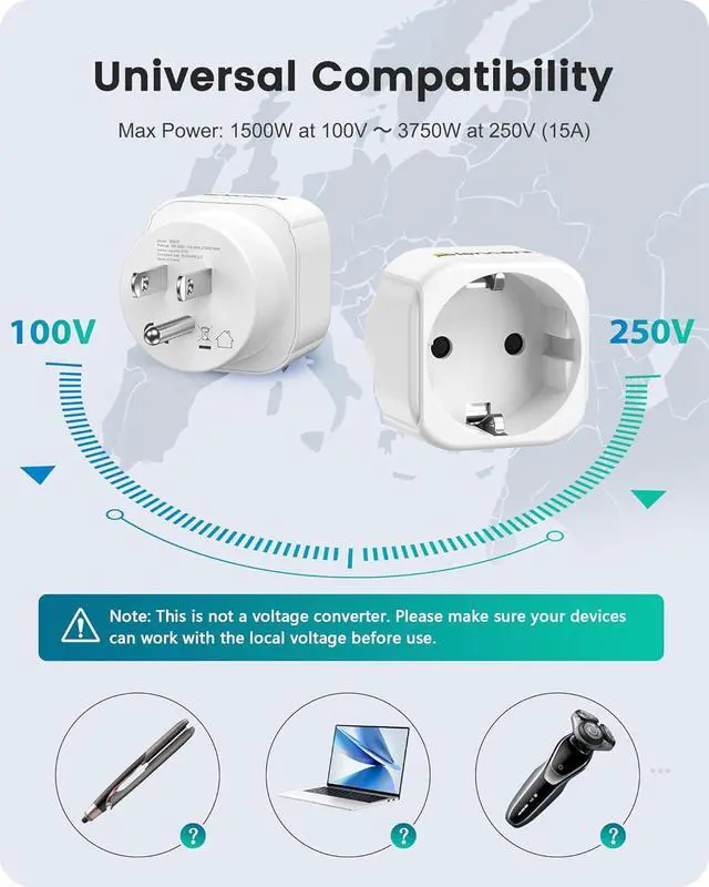 Attention: This product is plug converter, not voltage converter. Please check your devices before use make sure they support 110V-240V dual-range input, otherwise you may need a voltage converter