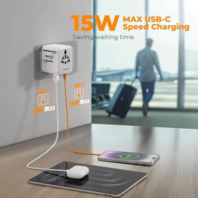 Universal Plug Adapter with USB-C: International travel adapter quickly power your smartphone, tablets, earphones, and more; This US to Europe plug adapter provides 3 USB C (15W Max per port) and 2 USB A (12W Max) ports to meet all your charging needs. All the