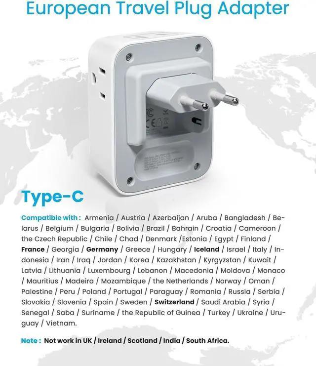 Europe Plug Adapter: Compatible with most European countries such as Austria, Belgium, Croatia, Denmark, Finland, France, Germany, Spain, Turkey, Iceland, Italy, Israel, Switzerland, Amsterdam. More country list can be checked in description. (NOTE: NOT WORK in UK/Ireland/Scotland)