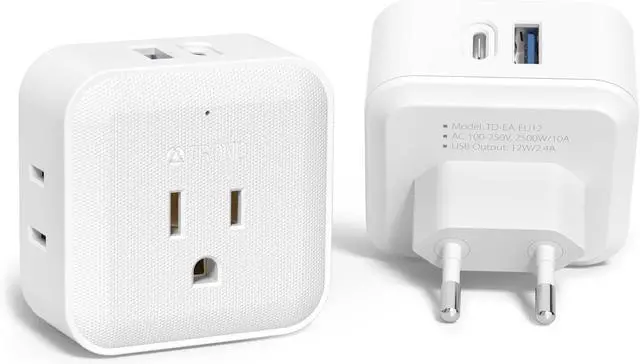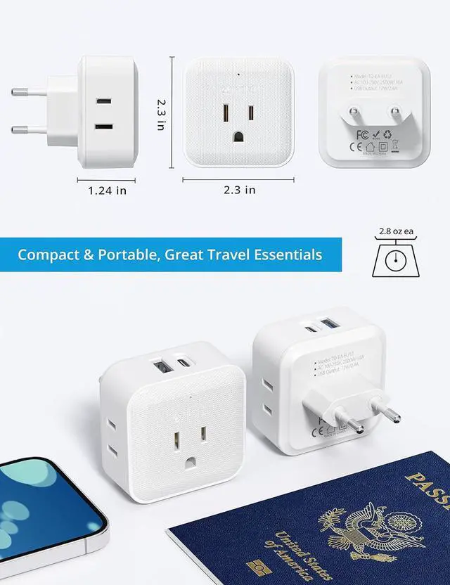 6 in 1 Travel Adapter for Europe. This US to Europe plug adapter is useful in Europe, and quickly expands a single Europe outlet to 4 USA sockets, with additional USB slots, both USB A and USB C are built in, so you can charge nearly any device, new or legacy in one place. Great Europe travel essentials.