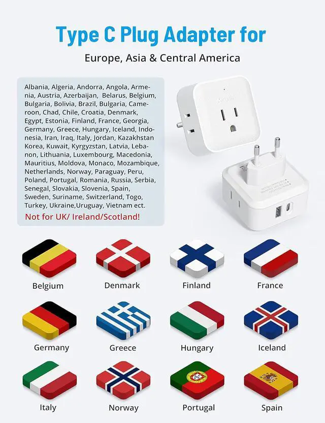 US to Europe Travel Plug Adapter. This Type C outlet adapter is ideal for your trip to most European countries such as Belgium, Denmark, Finland, France, Germany, Greece, Hungary, Iceland, Italy, Netherlands, Norway, Poland, Portugal, Spain, Turkey and more. NOT for UK, Ireland, Scotland.