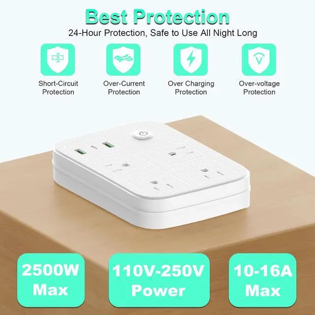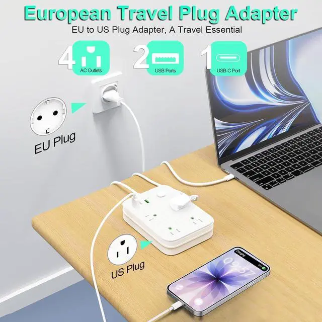 European Power Strip: This European to US plug adapter includes 4 AC outlets and 3 charging ports (1 USB C + 2 USB), eliminating the need for other plug adapters and keeping your desktop organized. The 4 US outlets (10A/2500W MAX) and 3 charging ports ( 3.1A /15W MAX) make it essential for travelers, businesspeople, and students visiting eligible areas.