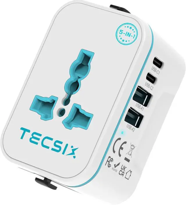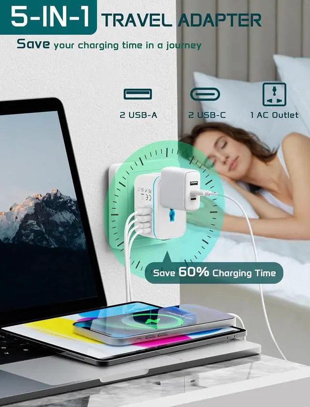 5-in-1 Universal Travel Plug Adapter: Equipped with 2 USB-C (5V, 3A, 15W), 2 USB-A (5V, 2.4A, 12W), and 1 AC port, the travel outlet adapter allows you to charge your phone, tablet, smartwatch, powerbank and more at once for your world wide travel. More Charge, Less Wait!