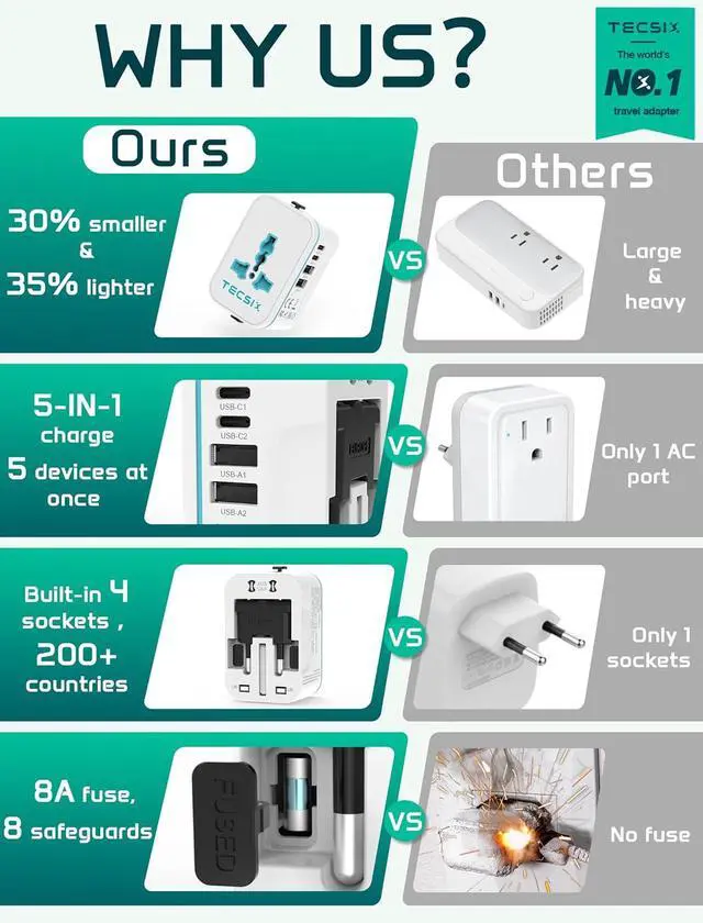 Type A: USA, Canada, Japan, etc. Forget carrying multi plug adapters all you need is one TECSIX all-in-one travel adapter!