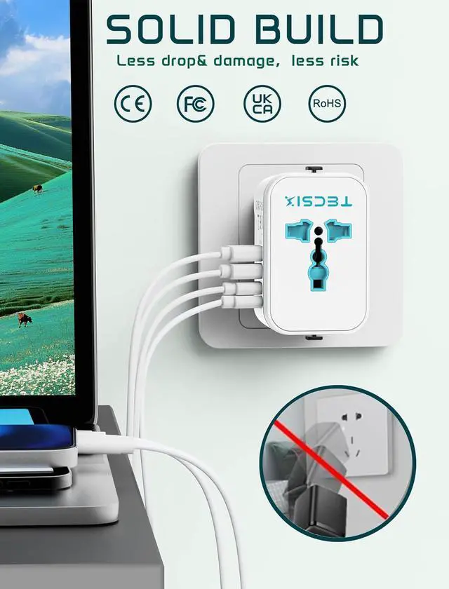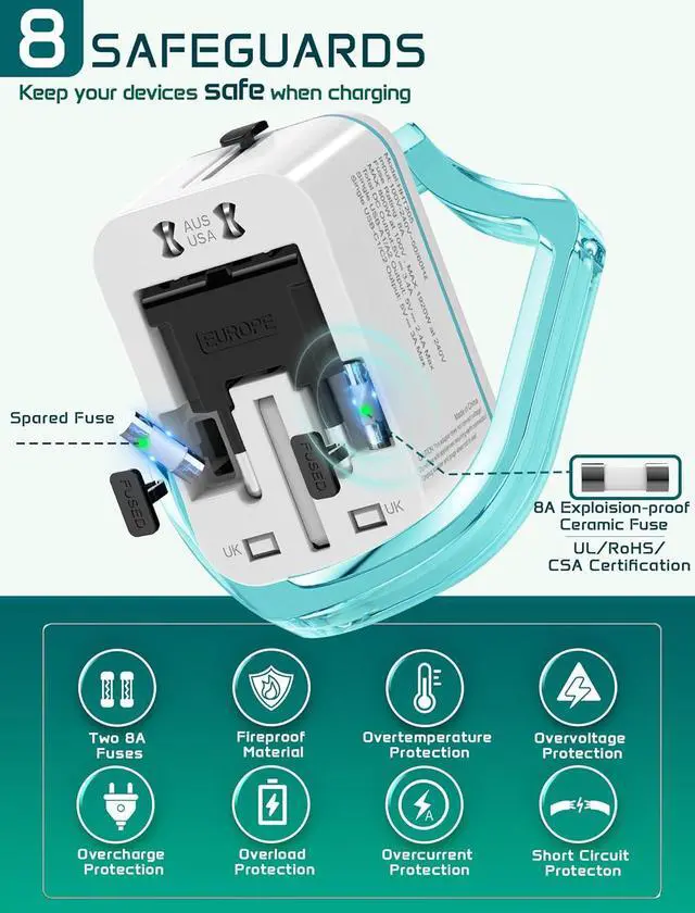 Safe & Smart Charging: With 8 built-in safety protections, including overcharge, overvoltage, and overload safeguards, this adapter features 2 x 8A fuses and fireproof materials. FCC, CE, and RoHS certified to protect your devices while automatically boosting charging speed.
