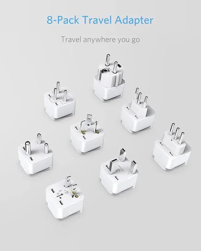 8 in 1 Input plug adapter: Accepts the standard prong flat pin Plug. No messy universal outlet.