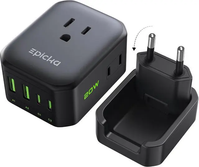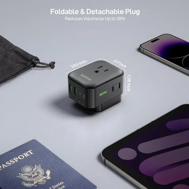 8-in-1 European Travel Plug Adapter: This European travel adapter features 8 outlets-4 AC sockets and 4 USB fast-charging Ports (including 2 USB-C). It offers more ports in a smaller size, measuring just 2.83 × 2.17 × 1.38 inches. The foldable prongs make it easy to pack and perfect for travel, while the thoughtfully designed outlet layout ensures the front-facing AC sockets never block the USB portsmaximizing charging efficiency in tight spaces.