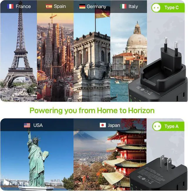 Fast Charge: This European plug adapter includes two USB-C ports that support fast charging. Both USB-C and USB-A ports support QC 3.0 or PD 3.0 quick charge technologies, delivering up to 5V/3A (20W max total) to charge your devices up to 30% faster than most standard travel adapters.