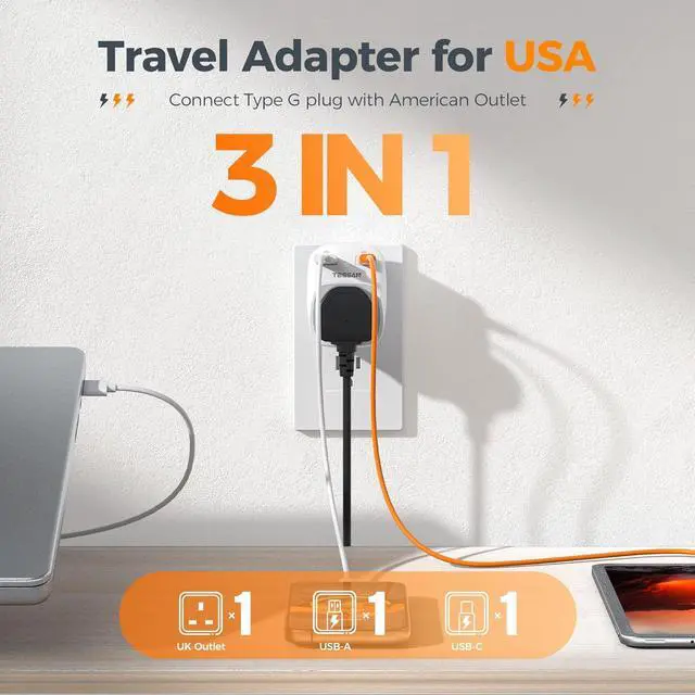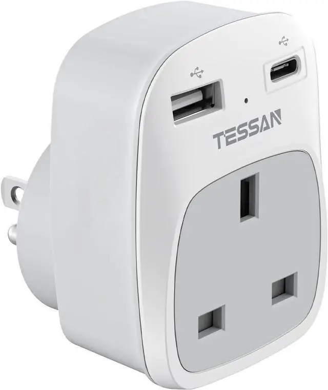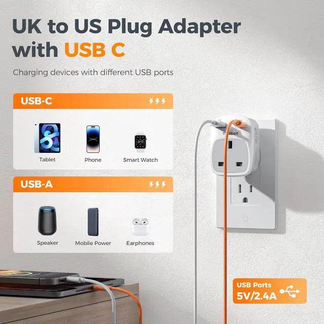 Unique Design: 3 in 1 travel adapter. This USA socket adapter is used to connect devices with UK (Type G) plugs to USA wall outlets. Max. power up to 1250W (Max. 125V, 10A). 2 USB ports can charge up to 2.4A. It is suitable for charging UK electronics such as cellphone, tablet, etc