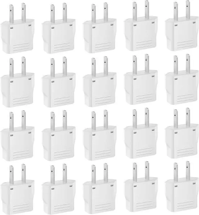 WHAT YOU GET: 20 Pack EU to US plug adapter. Our 7*24 friendly customer service for peace of mind. (We provide a warranty to cover any issues with the product. If you encounter any problems, we will offer repair or replacement)