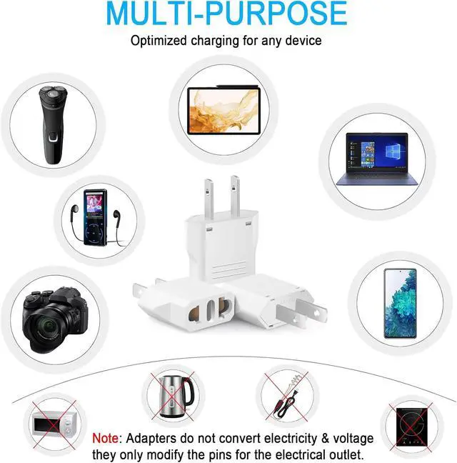 MULTI-PURPOSE: These plug converter europe to usa are very small electrical adapter plugs, perfect for charging Smart phones, Bluetooth speakers, cameras, tablets, shavers, headphones, laptops and so on. (Note: This is not a voltage converter; These plug adapter europe to us is only compatible for 110V to 250V wide voltage device)