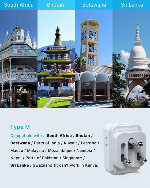 South Africa Plug Adapter: This type m adapter for South Africa compatible in overseas countries such as Bhutan, Botswana, Parts of India, Kuwait, Lesotho, Macau, Malaysia, Mozambique, Namibia, Nepal, Parts of Pakistan, Singapore, South Africa, Sri Lanka, Swaziland (It can' t work in Kenya)