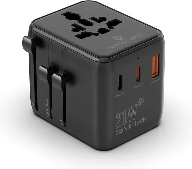 5-in-1 Charging Hub: Simultaneously charge up to 5 devices with 2 USB-C ports (20W Max), 1 USB-A port (18W Max), and 2 AC socketsperfect for phones, tablets, and more travel gadgets