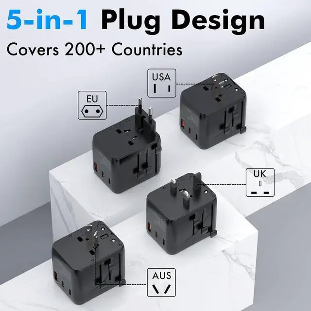Worldwide Compatibility: All-in-one adapter with 4 plugs (EU/UK/USA/AUS) covers over 200 countries, ensuring seamless charging across all travel accessories