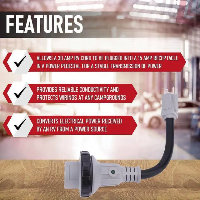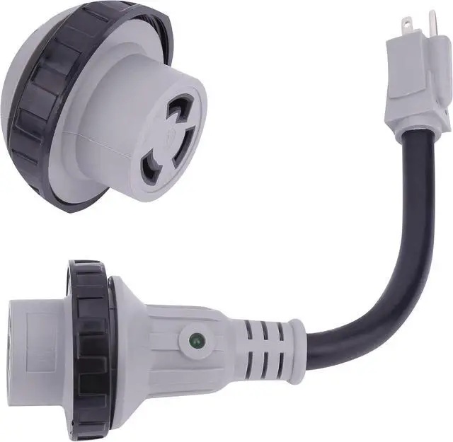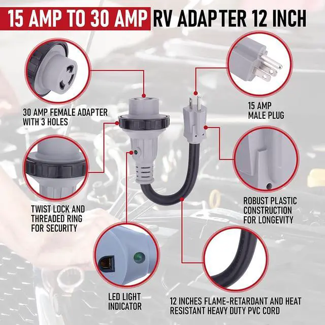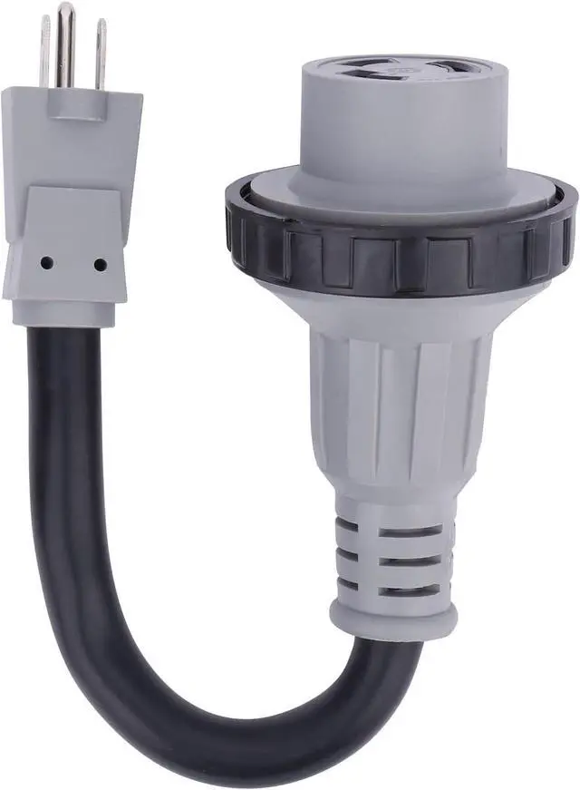 15 Amp to 30 Amp Power Inlet Adapter - This power adapter converts electrical power received by an RV from a power source and provides reliable conductivity. A 12" length cord with 5-15P male and L5-30R female adapter that allows a 30A RV cord to be plugged into a 15A receptacle in a power pedestal for a stable transmission of power and to protect wirings at any campgrounds. This is applicable to your travel trailers, caravan, motorhome and campers recreational vehicles.