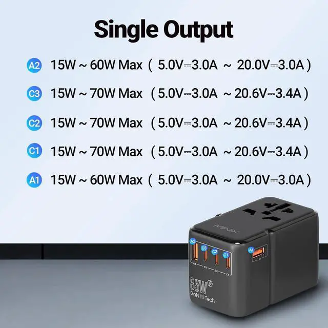 85W GaN III Fast ChargerMINIXs 85W travel charger built-in 3USB-C (PD 3.0 ), 2USB-A (QC 4+), 1 AC Port. 5-Ports GaN III Wall Charger delivers ultra-fast charging speeds.
