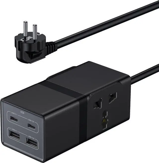 All-in-One International Power Adapter 6-in-1 universal power strip features 2 international AC outlets (accept US/UK/EU/AU plugs), 2 USB-A ports, and 2 USB-C ports. Simultaneously fast charge your laptop, phone, tablet, and other dorm romm home office essentials with a single, sleek power adapter