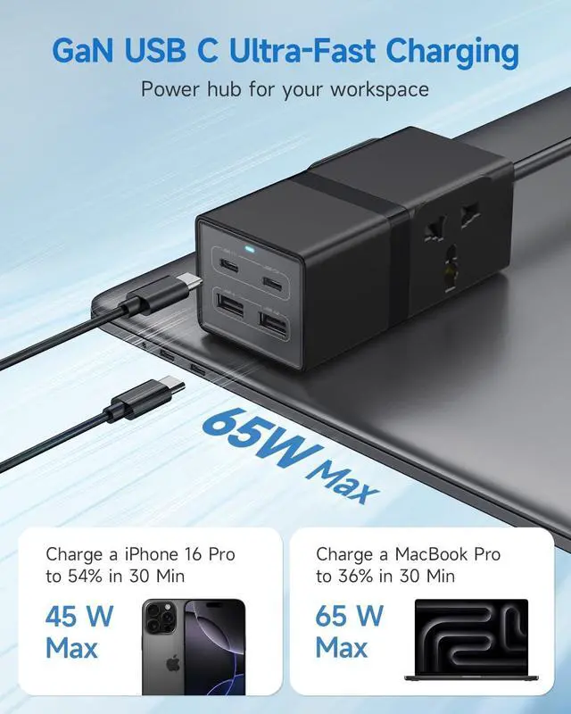65W GaN Tech for SuperSpeed ChargingPowered by advanced GaN technology, this universal power adapter delivers up to 65W of power from a single USB-C portcharging for MacBook Pro to 36% in just 30 minutes, keep working without slowdowns
