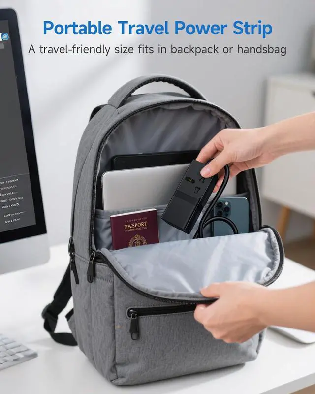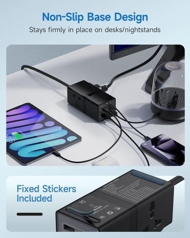 Compact & Non-slip DesignRoughly the same length as a smartphone and lightweight, this travel power adapter fits into tight bag. The non-slip rubber base ensures power strip stays firmly in place on desk or nightstand, preventing falls and scratches