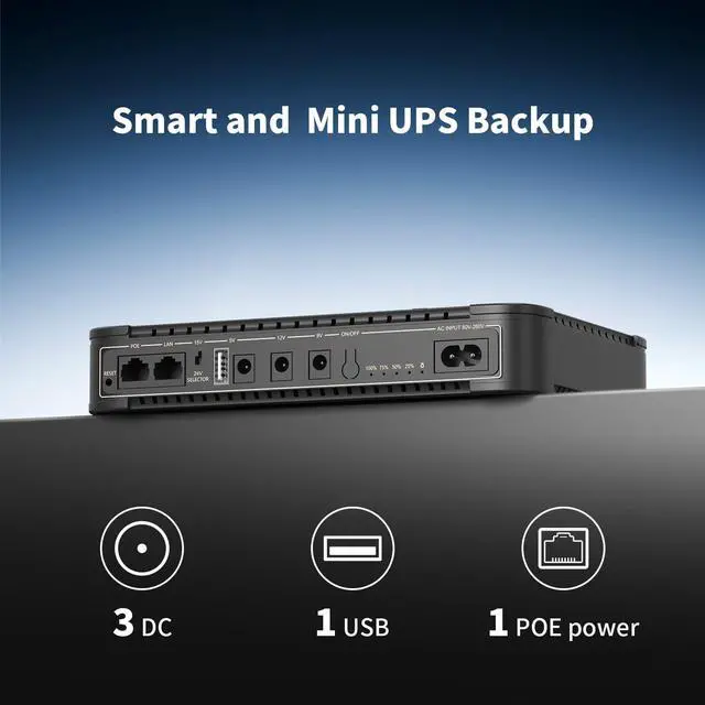 Wide CompatibilityOur small UPS offers versatile outputs: one 5V/2.6A USB-A port, 3 DC5521 outputs (5V, 9V, 12V), and exclusive support for 15V or 24V PoE power. It's a perfect ups battery backup for WiFi router, monitor camera, LED displays and most other digital devices. Also, this uninterruptible power supply has wide AC input voltage range of 80-260V, you can charge it easily
