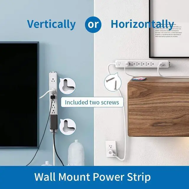 Wall Mount & Space SavingThe wall mount power strip has holes on the back and 4 mounting brackets on each corner for wall-mounted options, so you can install this long extension cord power strip 25ft in various applications, including workbenches, desks, wall mounts, floor mounts, under counters, dorm room & more, saving desktop space for you.