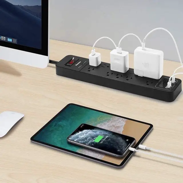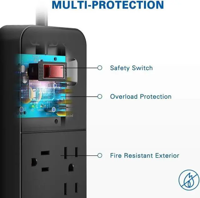 12 US standard AC surge-protected outlets power board, with 2390-Joule surge strip protection energy rating, protect your home and office devices from voltage fluctuations, surges and spikes