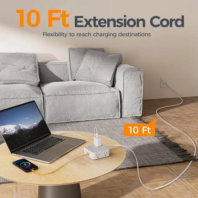 11 in 1 Plug Extension Outlet: Power strip with USB ports has 8 AC outlets (1250W Max), 1 USB C (15W Max) and 2 USB A (12W Max per port); Flat plug power strip with 10 ft extension cord allow you to charge 11 devices simultaneously, reducing waiting time